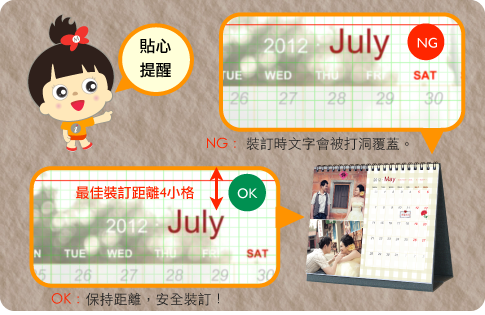 桌曆編排教學 桌曆編排需留意裝訂位置,線圈裝訂需預留至少4小格的空間,因此重要圖文千萬不要置放在這個範圍內喔!除了線圈裝訂位置,也請留意四邊的安全距離,重要圖文千萬要距離4小格以上,才能讓作品完美呈現喔!
