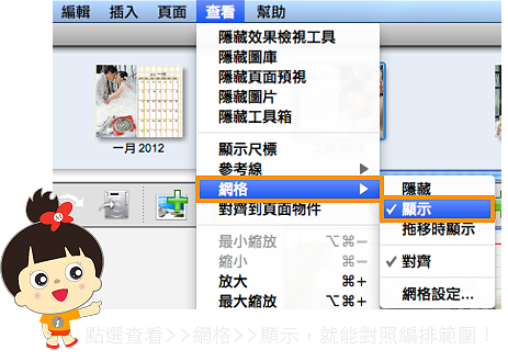 溫故知新 再來溫習一下編排頁面:紅色裁切線外的物件在印後加工會被裁切掉,建議勿將圖文太靠近裁切線,保持10mm至25mm的安全邊距(至少4小格),圖像則可出血至頁邊。這邊提到的4小格為軟體的「網格」,可參照下圖勾選顯示,編排時較清楚適當的編排範圍。